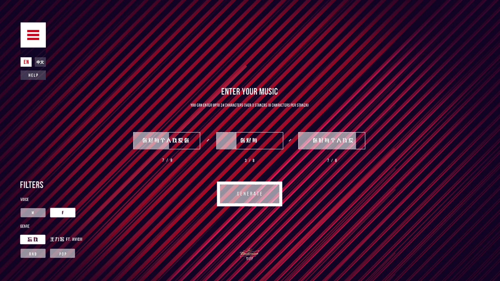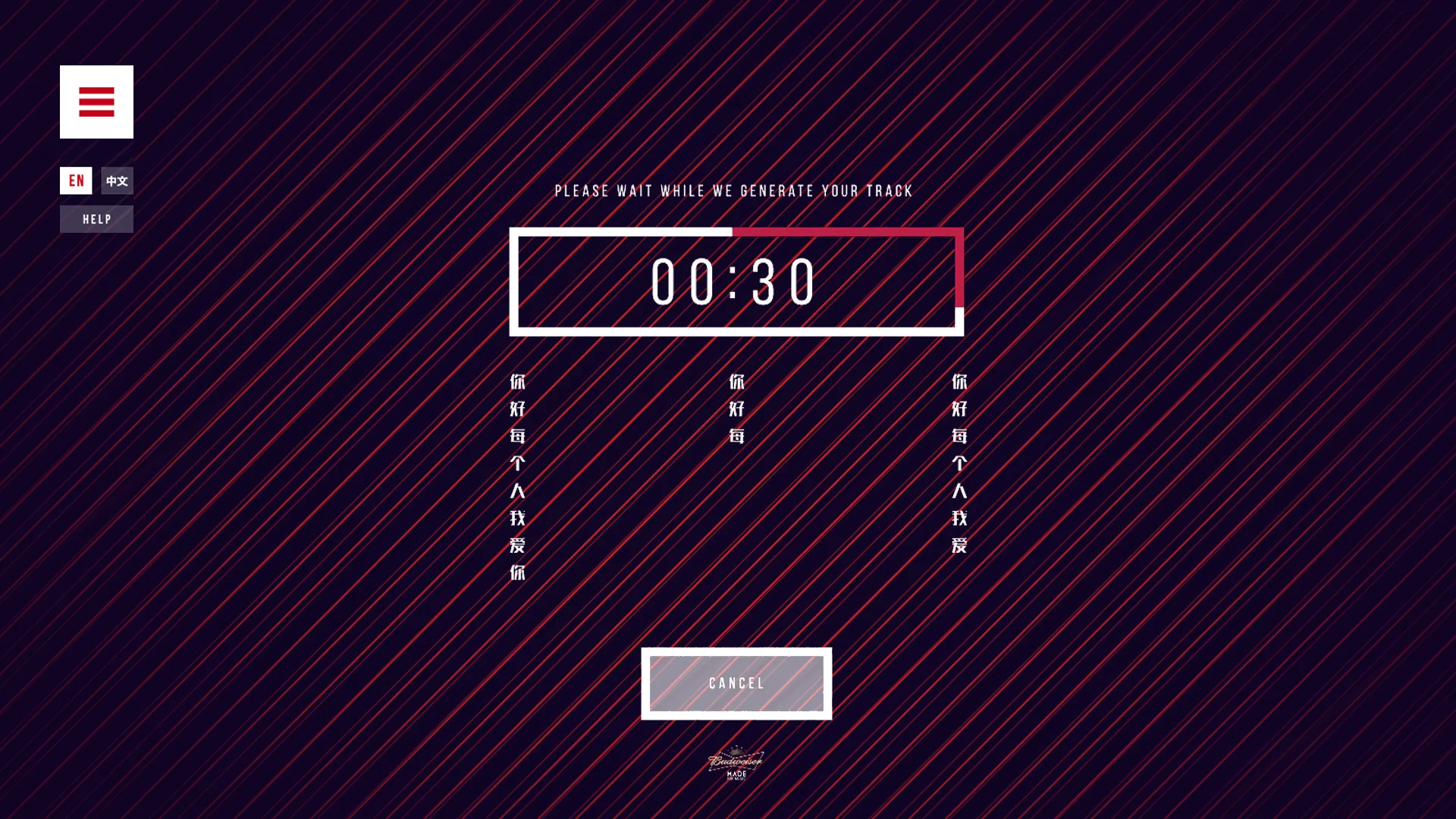 We designed and programmed a responsive digital tool to help Budweiser promote their passion project. The site allows each user to type a message, which is translated into a vocoded male or female voice (think auto-tune with both Chinese and English speaking harmonies). From this message a unique song and abstract music video is created.
